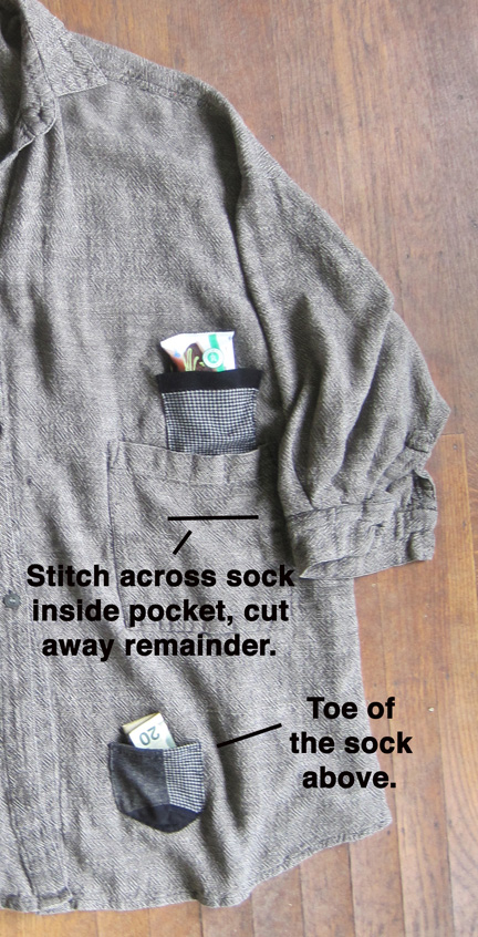 This sewing/mending/upcycle solution addresses two common problems: lost socks and lack of pockets. Combine the two and you have sock pockets.