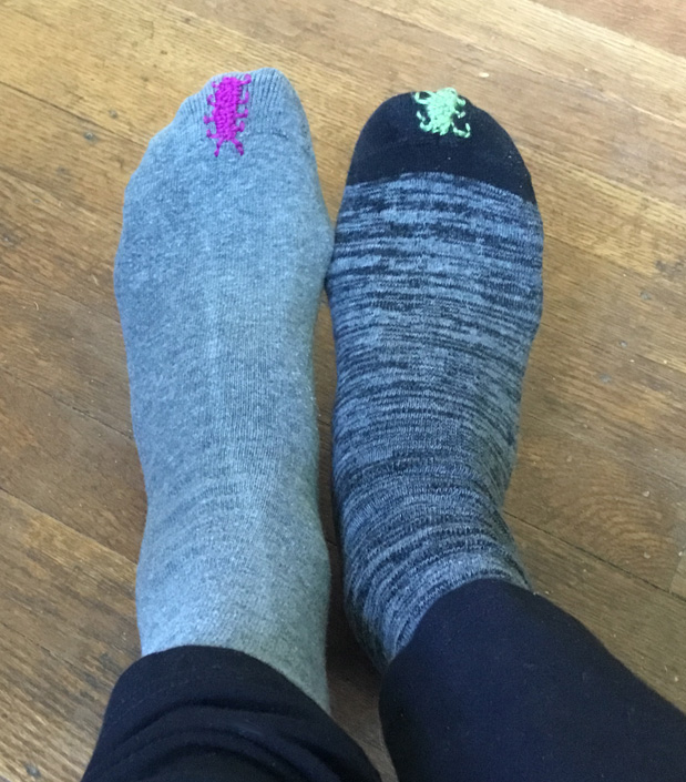First let me say this isn't about the cost of a sock. This is about fighting back against the throw-away, out-of-control consumerism that has brought us to the brink of the apocalypse. It is also about combatting the emotional embarrassment of finding yourself at someone's house or, worse yet, a spiritual retreat in Ojai, where it becomes clear that the exception is that everyone is expected to remove their shoes. And it is about cute little bugs. It is a win-win scenario. Part of the Summer of Invention has been about tuning in to quotidian, annoying little problems that generally go unnoticed and figuring out how to fix them.